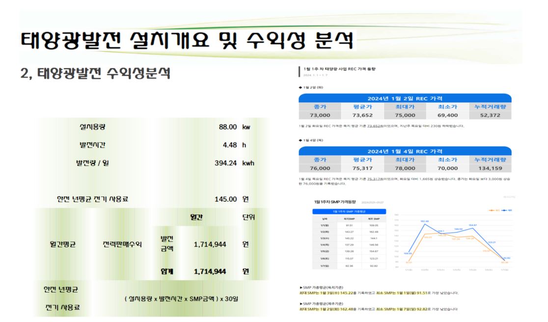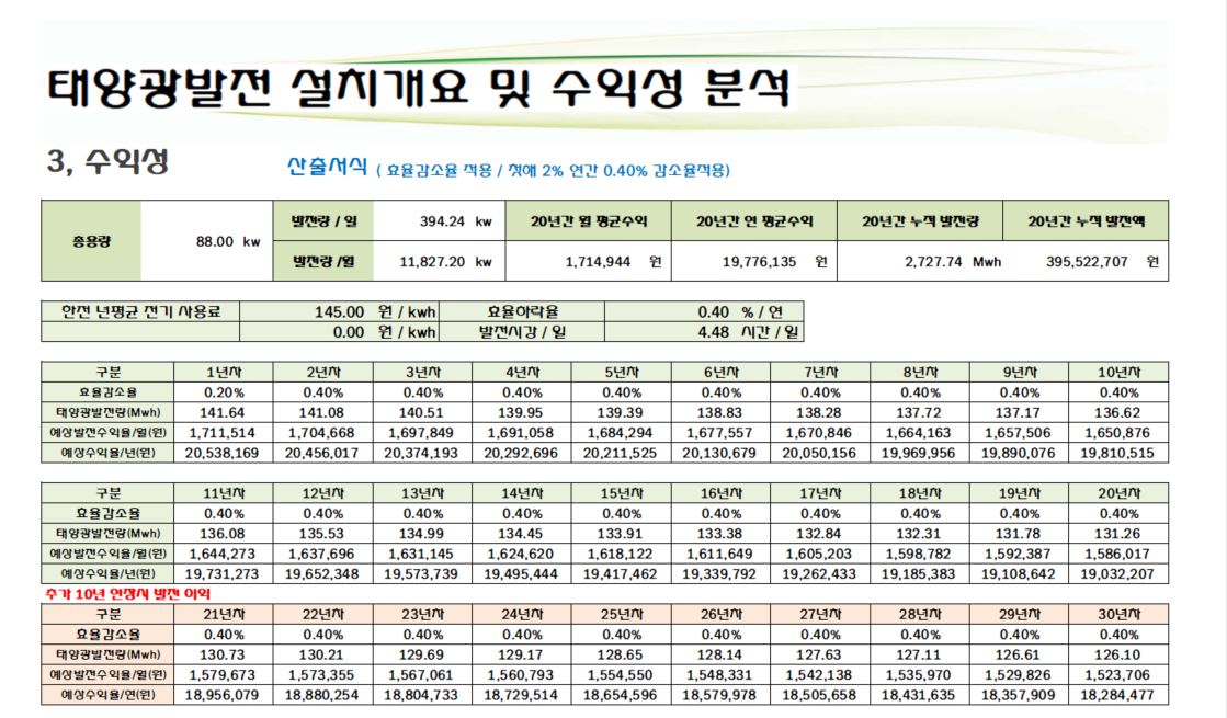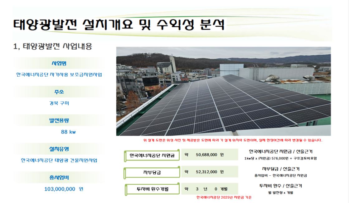 한국에너지공단 태양광발전 자가사용 지원사업으로 보조금 50,688,000원을 받아 시공하여 자부담 투자금 환수기간은 약 3년으로 시공완료하였습니다.