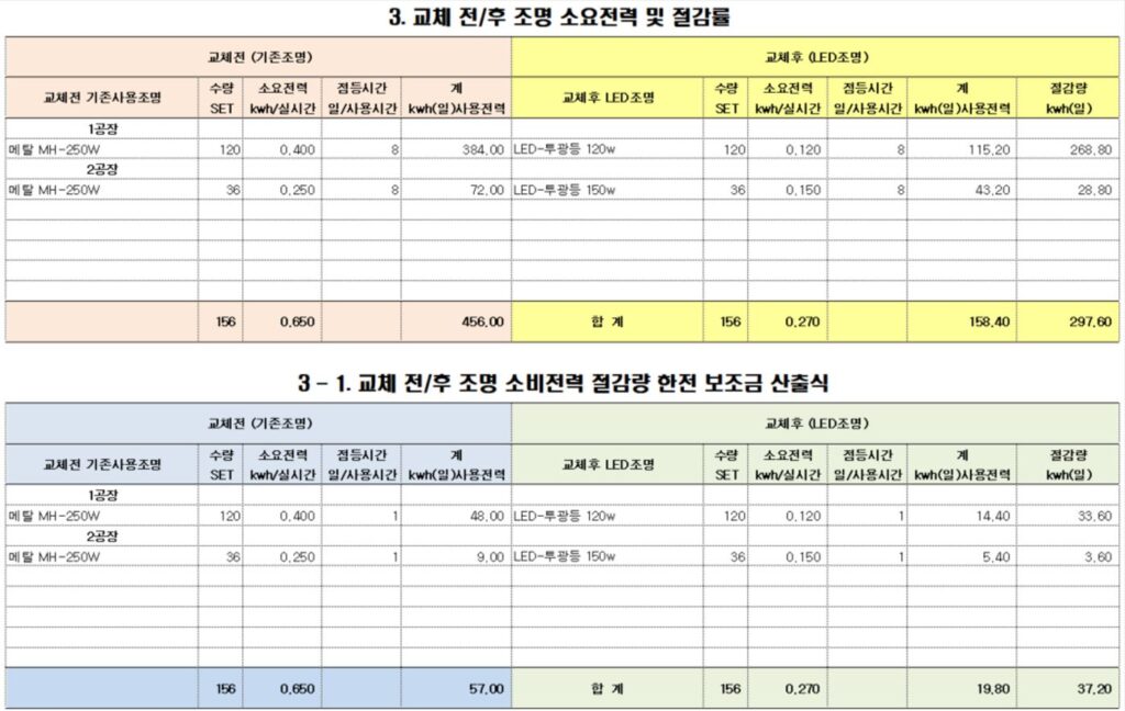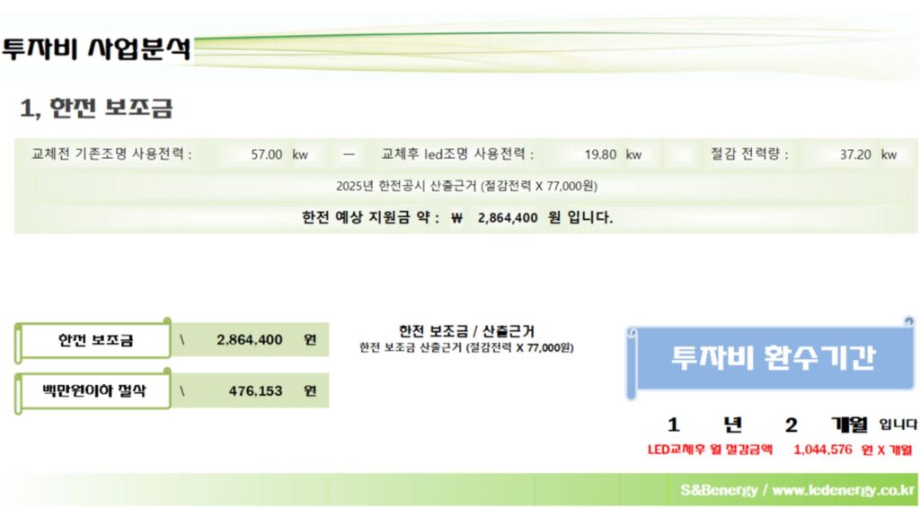 시공후 에너지절감률 약65.30%이며 년간 에너지절약 가능금액은 약12,534,912원예상, 고효율 LED조명 교체후 에너지절약 부분으로 투자금 환수기간은 약1년2개월입니다.