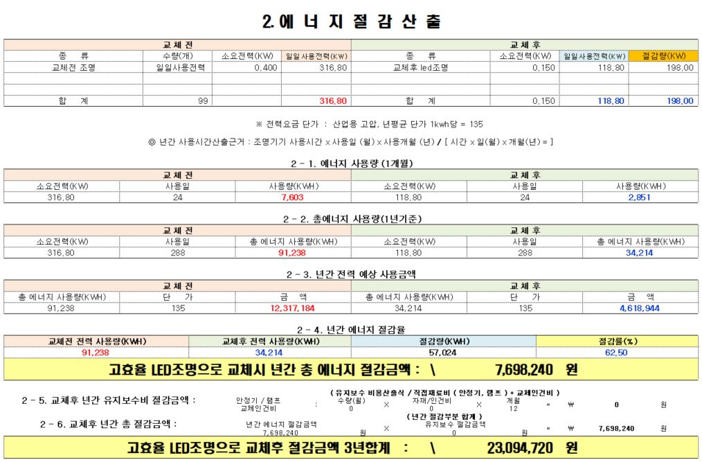 시공후 에너지절감률 약62.50%이며 년간 에너지절약 가능금액은 약7,698,240원예상, 고효율 LED조명 교체후 에너지절약 부분으로 투자금 환수기간은 약1년5개월 입니다.