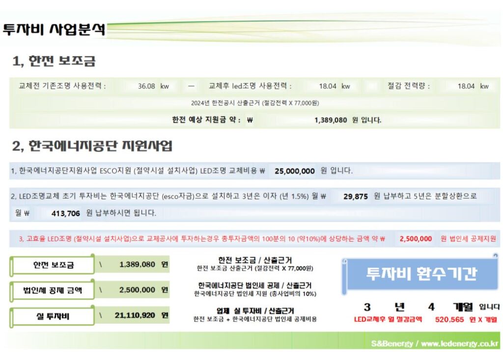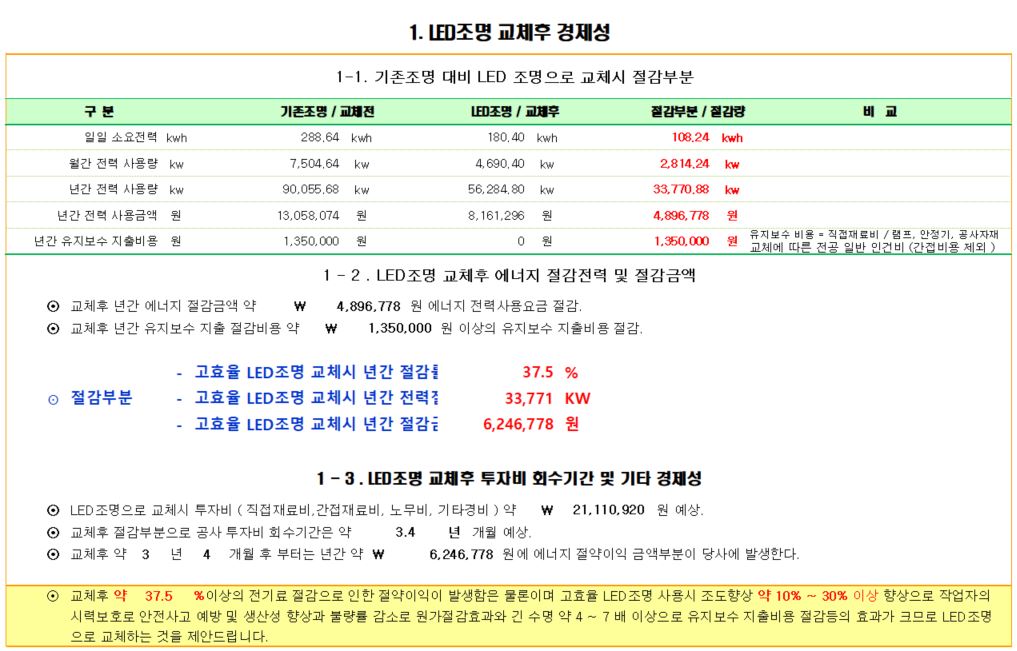 위 현장은 고효율led면조명 320*1280mm / 40w로 교체공사를 진행하여 기존대비 에너지 절감률 약 37.50%이며 년간 에너지절약 가능금액은 약 4,896,778원정도 예상되며 투자금 환수기간응 약 3년4개월 정도예상 및 기타 유지보수 비용절감, 화재예방 및 생산성향상, 업무환경개선 효과가 기대됩니다.